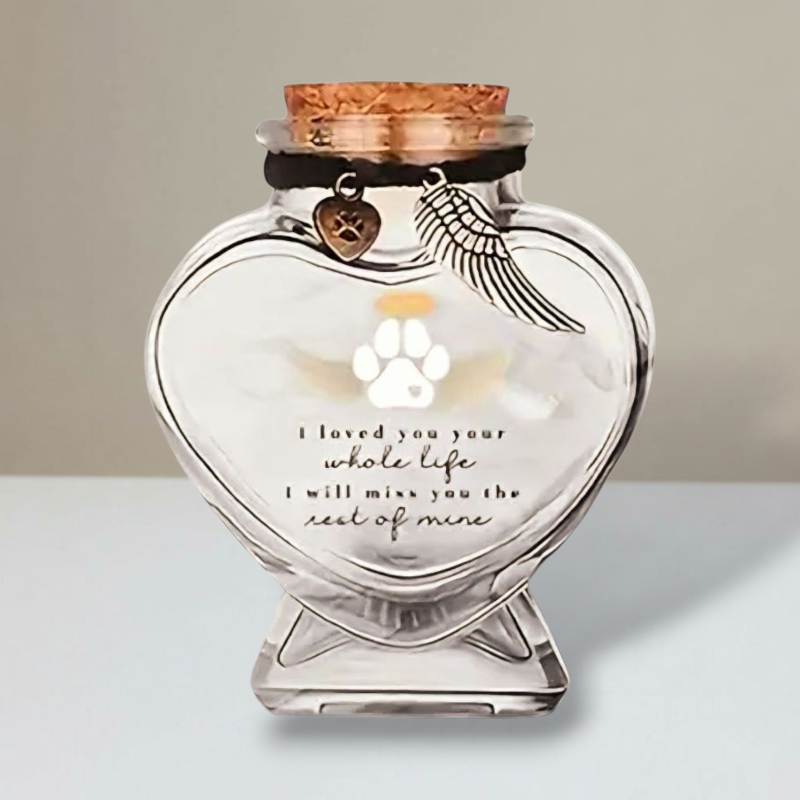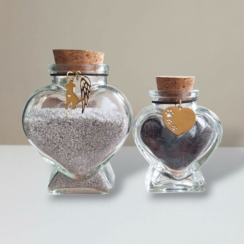 Die kleinen Erinnerungsflaschen lassen sich leicht an einem besonderen Ort platzieren, beispielsweise in einer Gedenkecke oder neben einem Foto. Das Herz schafft eine bleibende Erinnerung, die Ihnen täglich Kraft und Trost spenden kann, entweder einzeln oder in Kombination mit einer Hunde- oder Katzenurne.