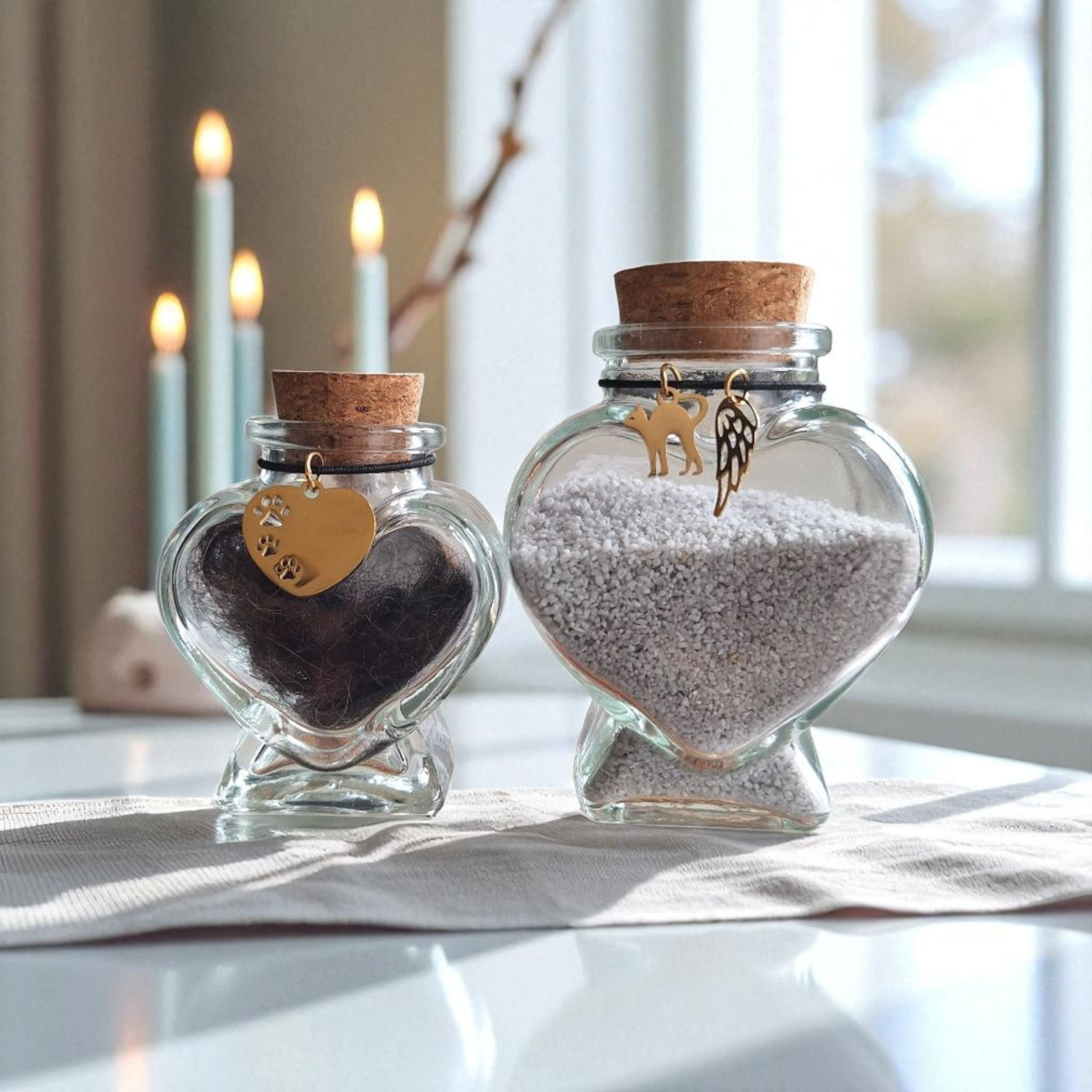 Memorial flesjes voor kat zijn een klein, persoonlijk aandenken aan je kat. Je kunt er een plukje haar van je kat in bewaren, maar ook snorhaartjes, tandjes of een kleine hoeveelheid as. Veel mensen gebruiken een memorial flesje als aanvulling op een urn of als onderdeel van een rustig gedenkhoekje met bijvoorbeeld een foto en een kaarsje.
