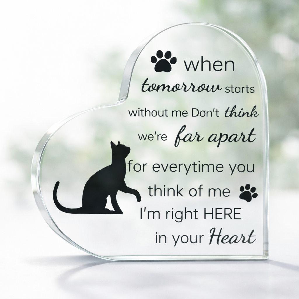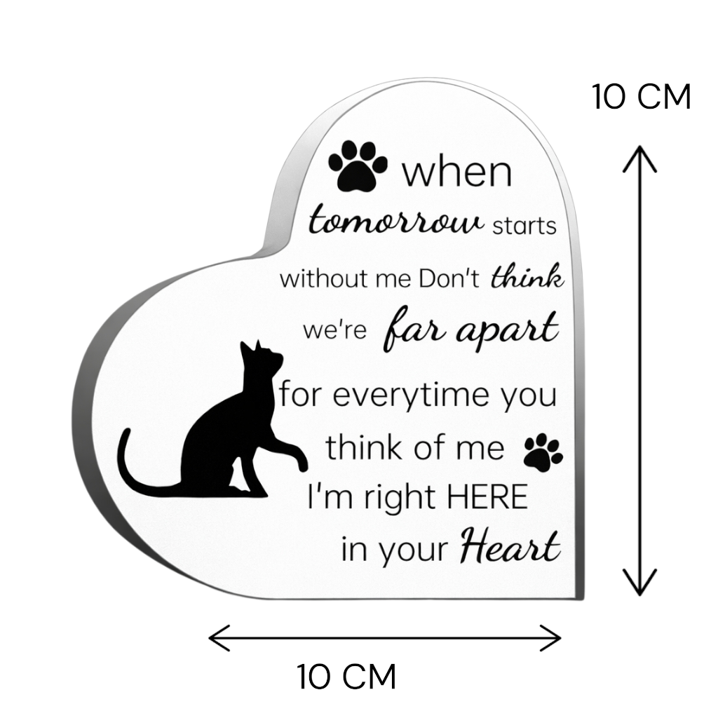 Dieses Acryl-Gedenkherz mit der tröstlichen Botschaft: „Wenn der morgige Tag ohne mich beginnt, denke nicht, dass wir weit voneinander entfernt sind. Du wirst immer an mich denken, ich bin in deinem Herzen“, eignet sich perfekt, um es neben Fotos, einer Urne oder in einer Gedenkecke Ihres Zuhauses aufzustellen. Diese Gedenkfigur ist ein wunderschönes Geschenk für Sie selbst oder für jemanden, der sich von einer geliebten Katze verabschieden musste.