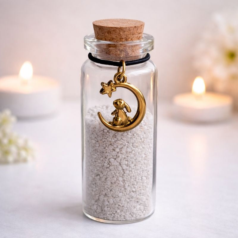 Eine liebevolle Erinnerungsflasche für ein geliebtes Kaninchen. Geeignet für eine kleine Menge Asche oder einen Teil davon, aber auch für Schnurrhaare oder eine Felllocke. Wunderschön für eine Urne oder ein Denkmal.