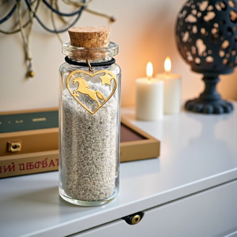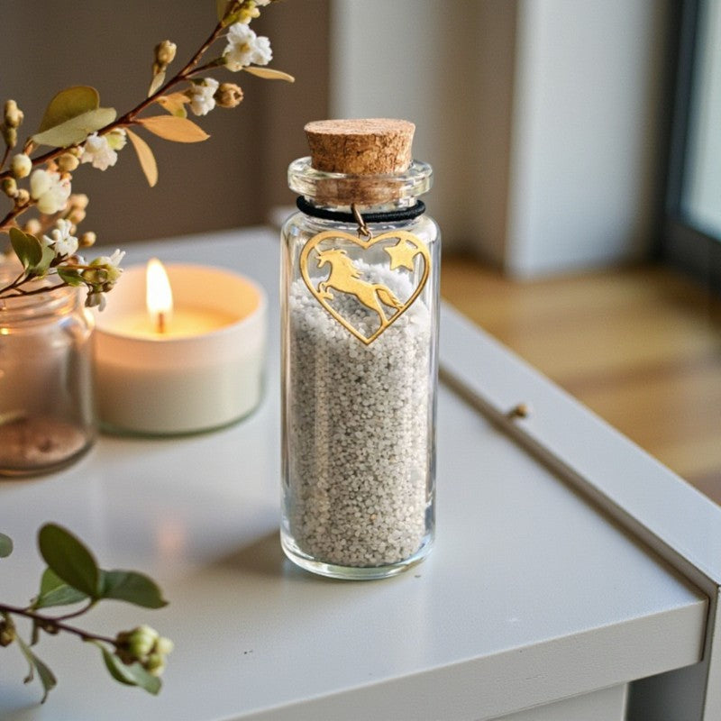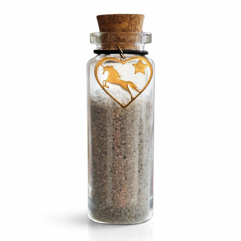 Diese Erinnerungsflasche ist eine wunderschöne und persönliche Art, die Erinnerung an Ihr geliebtes Pferd oder Pony zu bewahren. Ein goldfarbener Anhänger rundet das Geschenk ab.