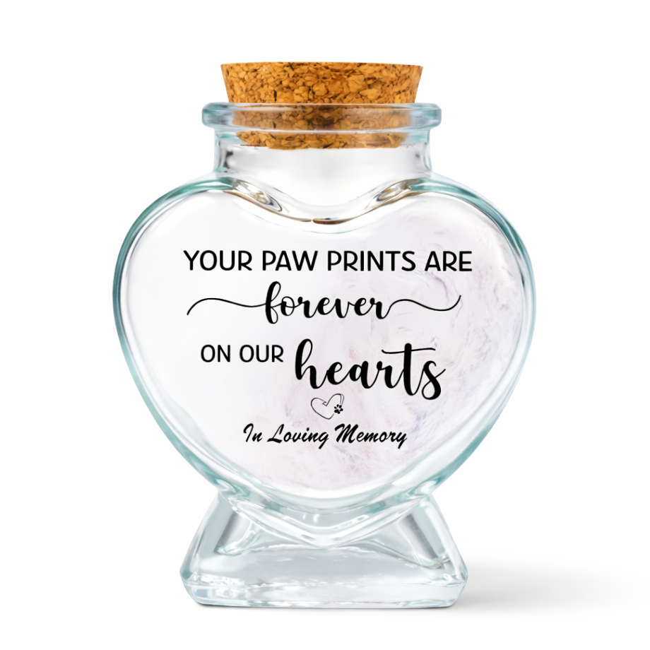 Diese Gedenkflasche mit der Inschrift „Deine Pfotenabdrücke sind für immer in unseren Herzen“ kann auch als kleine Glasurne für eine geringe Menge Tierasche verwendet werden. Ein liebevolles Andenken für Ihren Hund, Ihre Katze oder einen anderen Freund.