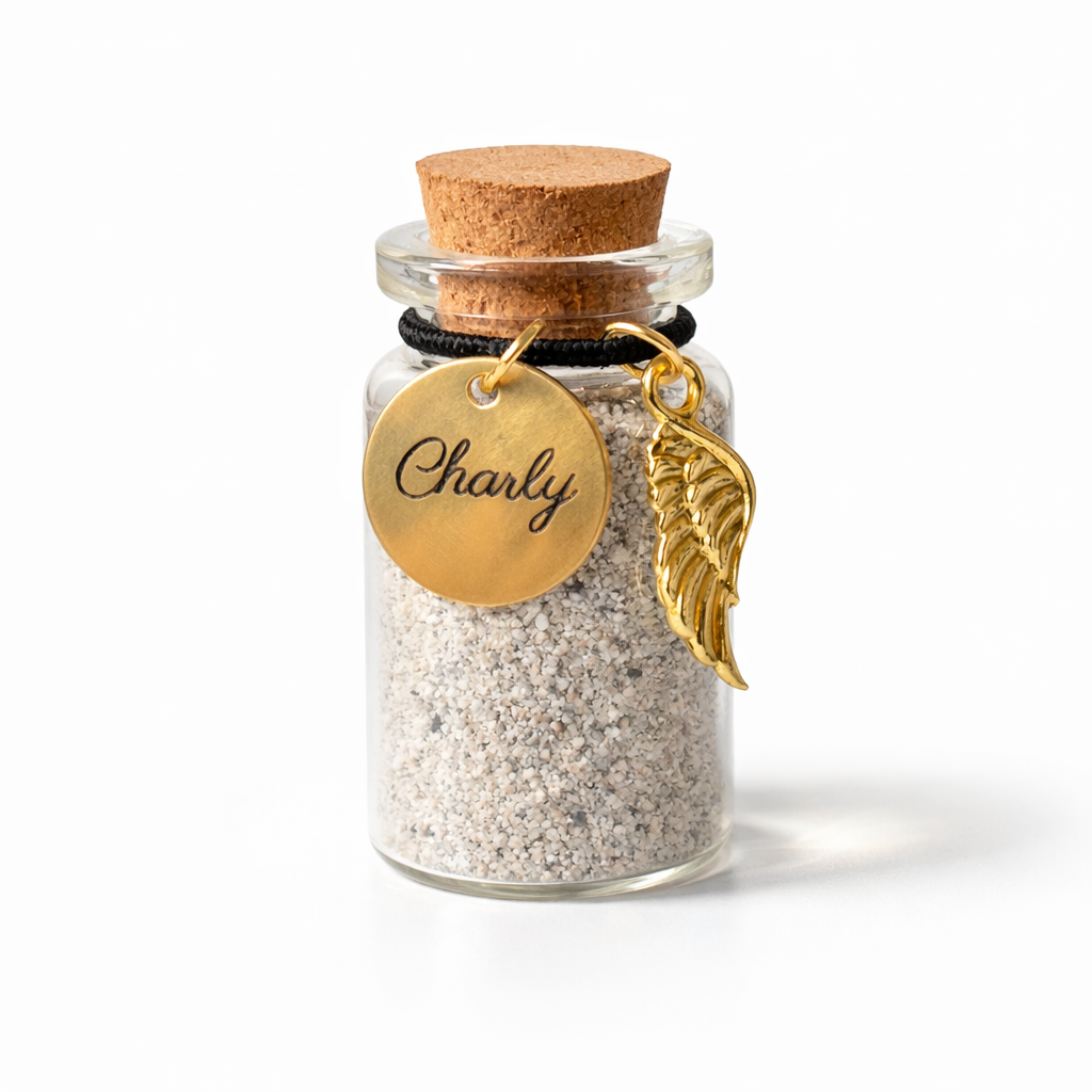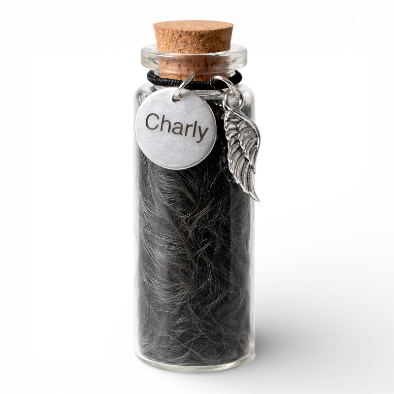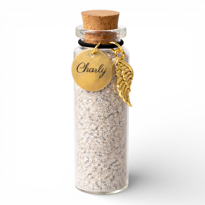 Je kunt kiezen uit twee kleuren voor de hanger, twee lettertypes en twee formaten voor het flesje.