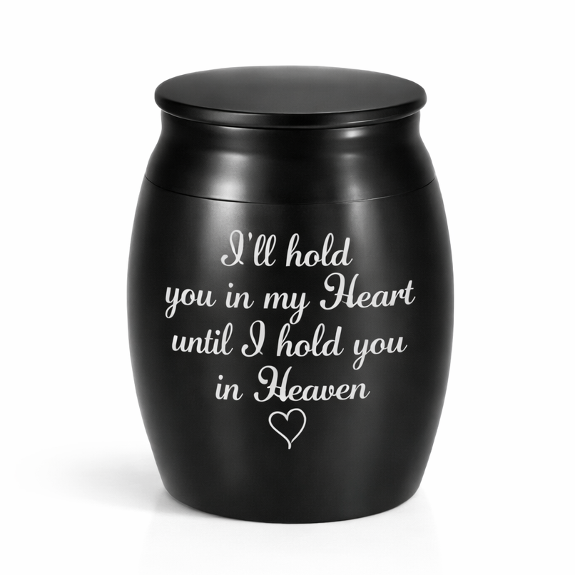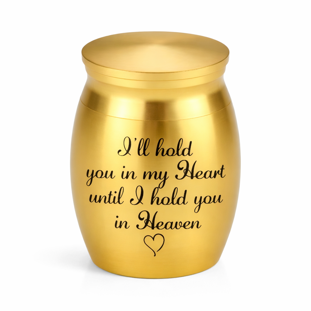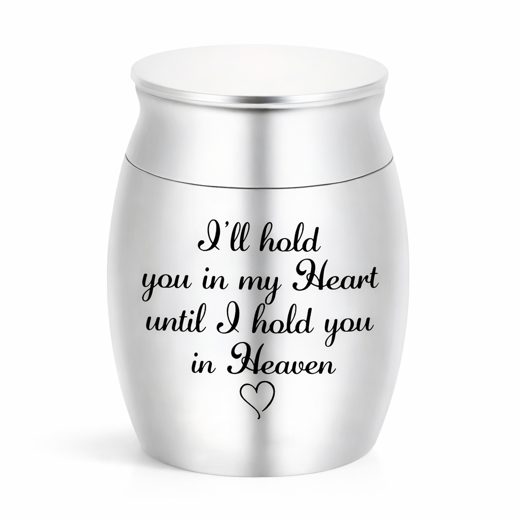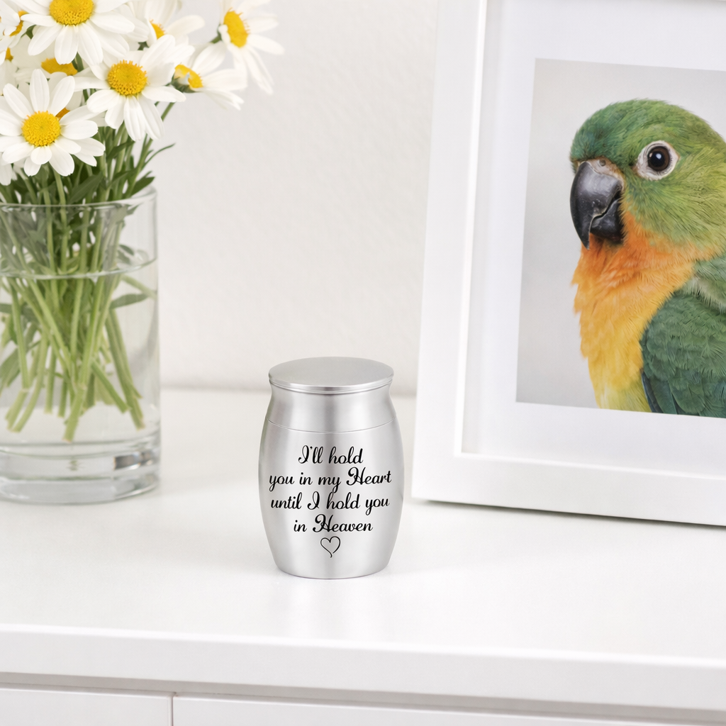 Diese Mini-Urne bietet einen wunderschönen Platz für die Erinnerung an Ihr geliebtes Haustier. Sie trägt die liebevolle Inschrift: „Ich werde dich in meinem Herzen tragen, bis ich dich im Himmel wiedersehe.“ Klein im Format, groß in der Bedeutung.
