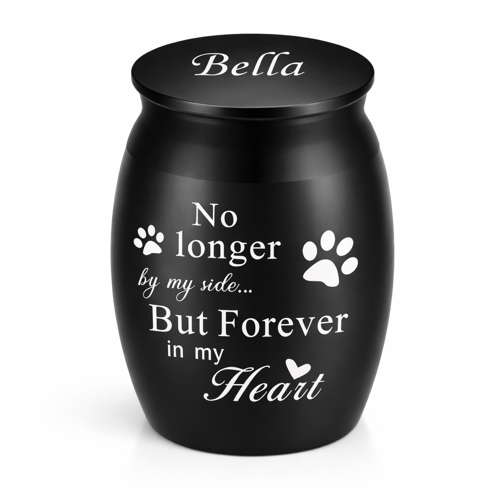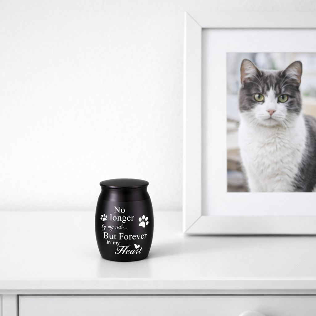 Diese stilvolle Mini-Urne ist ein liebevolles und dezentes Andenken an Ihr Haustier. Ihre kompakte Größe fügt sich unaufdringlich ein und passt perfekt auf eine Kommode oder in einen Gedenkbereich zu Hause. Die Inschrift „Nicht mehr an meiner Seite, aber für immer in meinem Herzen“ drückt die unvergängliche Verbundenheit mit Ihrem geliebten Tier aus. Ein kleines Denkmal mit großer Bedeutung.